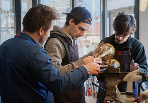 Adrien a à cœur de partager son savoir-faire et très ancré dans un esprit de transmission, il accueille des stagiaires et des apprentis dans son atelier. Il est membre de la Chambre syndicale et de la Facture Instrumentale (CSFI) et membre de la commission de révision des programmes en collaboration avec le ministère de l’Education Nationale. Son engagement aboutit à l’ouverture d’un CAP dédié à la facture de cuivres à l’ITEMM (Institut Technologique Européen des Métiers de la Musique). Enfin, Adrien anime régulièrement des conférences et des ateliers, et a mis en place une cinquantaine de podcasts « Cuivres à la Française ».