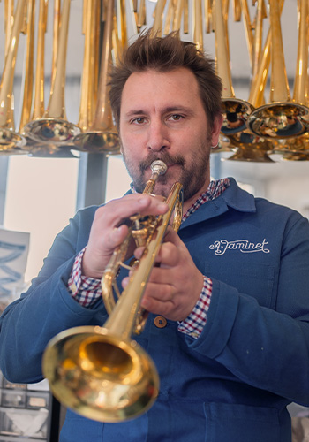 Dès son plus jeune âge, Adrien Jaminet se passionne pour la trompette grâce à son père. Il étudie au Conservatoire de Boulogne-Billancourt pendant 4 ans et découvre, lors d’un stage d’observation, le métier de luthier en cuivres.