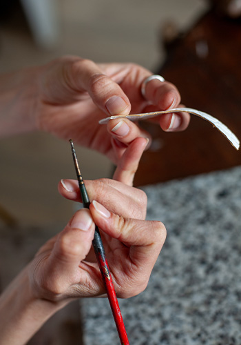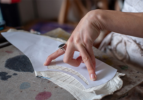 Pour ses marques Façons de Bottière et Liseré d’Or, Claire s’engage pour une production éco-responsable et privilégie la qualité et la provenance des matériaux. Elle choisit avec soin, voire fabrique elle-même, des matériaux écologiques – peaux, laines, fils, teintures, colles et emballages – favorisant les options locales et artisanales. Son approche écologique se traduit par la recherche de matériaux plus sains, nobles et de provenance traçable, l’utilisation de tannages végétaux et de fil de soie français et l’approvisionnement en liège auprès d’un fabricant français. Le bien-être animal est également une préoccupation majeure pour Claire. Elle utilise des peausseries provenant d’élevages responsables pour créer un feutre noble. Elle élève elle-même des lapins angoras et utilise leur laine, feutrée sur du lin, pour certains modèles. Claire favorise enfin la dynamique du travail d’équipe avec quelques artisans de choix, main dans la main, comme un soutien mutuel par le biais de la sous-traitance.