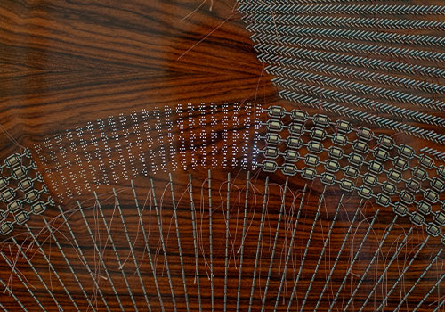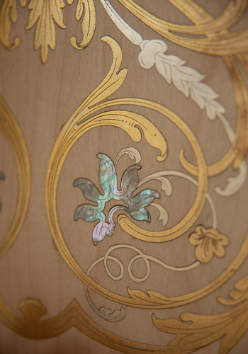 Grâce à ses importants chantiers d’ébénisterie et de marqueterie, Jean-Brieuc a pu investir dans le développement de sa technique unique de broderie sur bois. Pour chaque projet, il crée un décor réalisé sur ordinateur pour déterminer la taille et la position des perles. Ce décor est ensuite appliqué sur un placage de bois, qui est percé puis brodé à la main. Le bar Cosmo, imaginé comme un cabinet de curiosités, est né de ce procédé en 2021. Dans une démarche éco-responsable, Jean-Brieuc recycle les chutes de panneaux pour d’autres projets et utilise les chutes de bois massif comme bois de chauffage.
