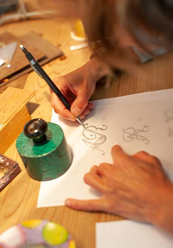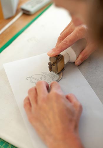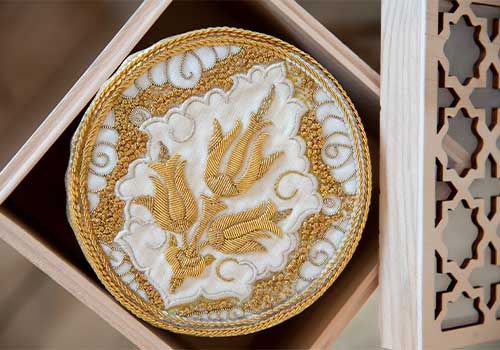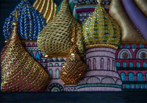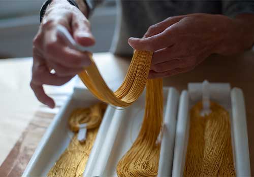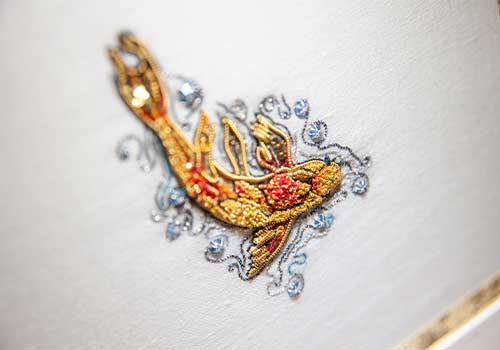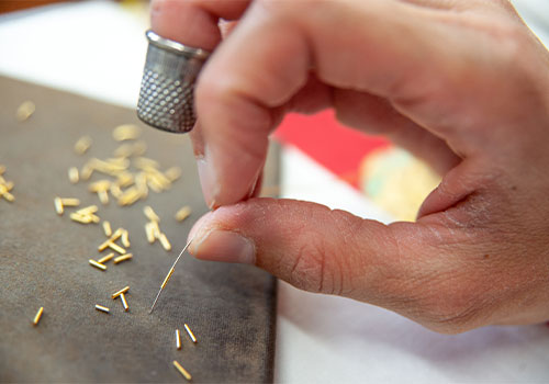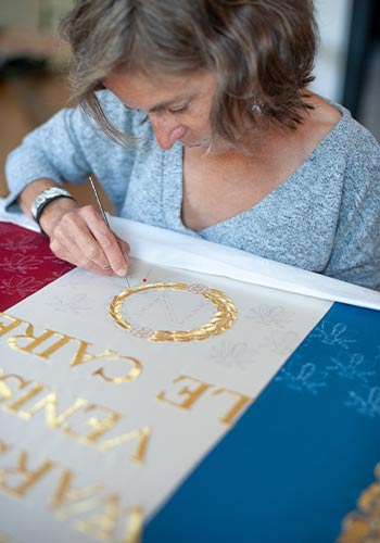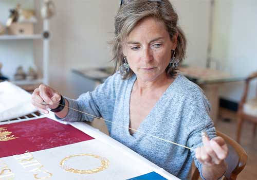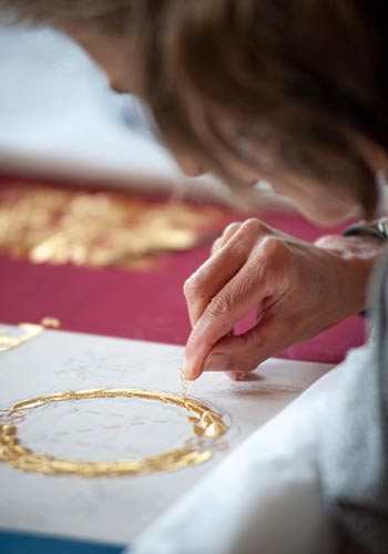 Sylvie Deschamps est brodeuse au fil d’or. Après ses études, elle est entrée aux Etablissements Bouvard et Duviard à Lyon, spécialisés en restauration de broderies anciennes et religieuses. Elle y est restée six années et a ensuite intégré l’atelier de broderie Le Bégonia d’Or à Rochefort dont elle est aujourd’hui directrice. En 2010, elle a reçu le titre de Maître d’Art Brodeuse au Fil d’or en France qui garantit la transmission de son savoir-faire.