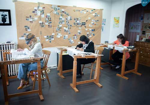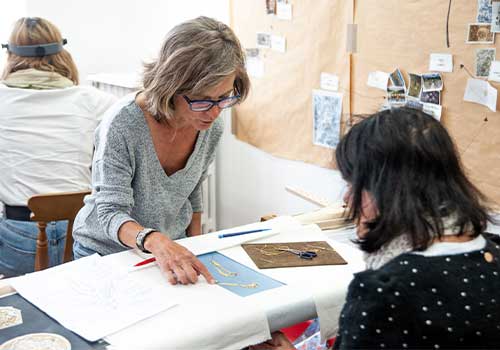 Des stagiaires de tous niveaux ainsi que des personnes en reconversion professionnelle sont accueillis et formés chaque année dans l’atelier de Sylvie Deschamps. C’est une véritable formation reconnue par les grandes maisons de luxe. L’atelier est également un écomusée et accueille des visiteurs pour faire valoir son art.